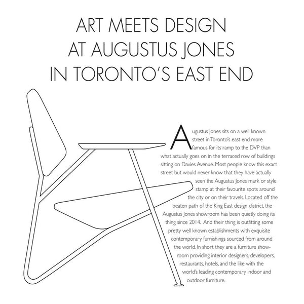 Augustus Jones featured in the September issue of Distillery District Magazine. Discussing contemporary furniture in Toronto, brands Prostoria and TON, and artists Jeff Jackson.