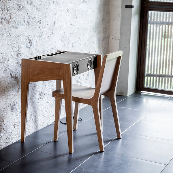 Sleek, minimalist designs integrate seamlessly into interiors and resemble a desk or side table, expertly hiding speakers, amplifiers and a central sub woofer allowing for real High-Fidelity sound, requiring one plug only.