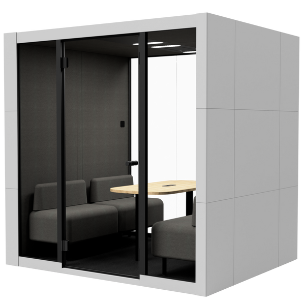 Experience tranquility and comfort with SPARK⁴. Enter a world of acoustic perfection with a meeting room designed for two to four people. This serene environment boasts enhanced durability, sleek design, and cutting-edge technology, making it the ideal choice for both offices and production halls focused on performance. These acoustic elements ensure complete isolation from disruptive noises, providing the perfect mobile office experience.
